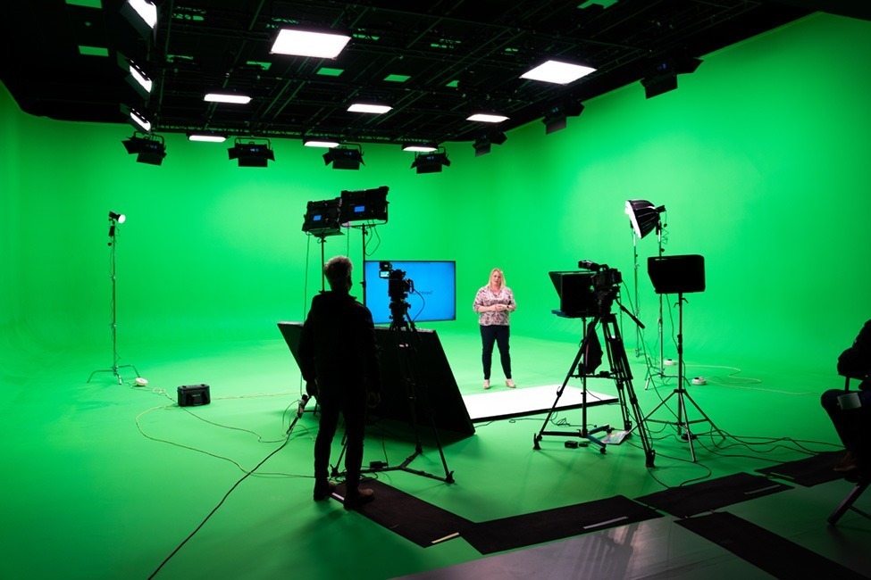 Double height green screen infinity cove sound stage with 2.7m balcony and pre-lit automated lighting grid.